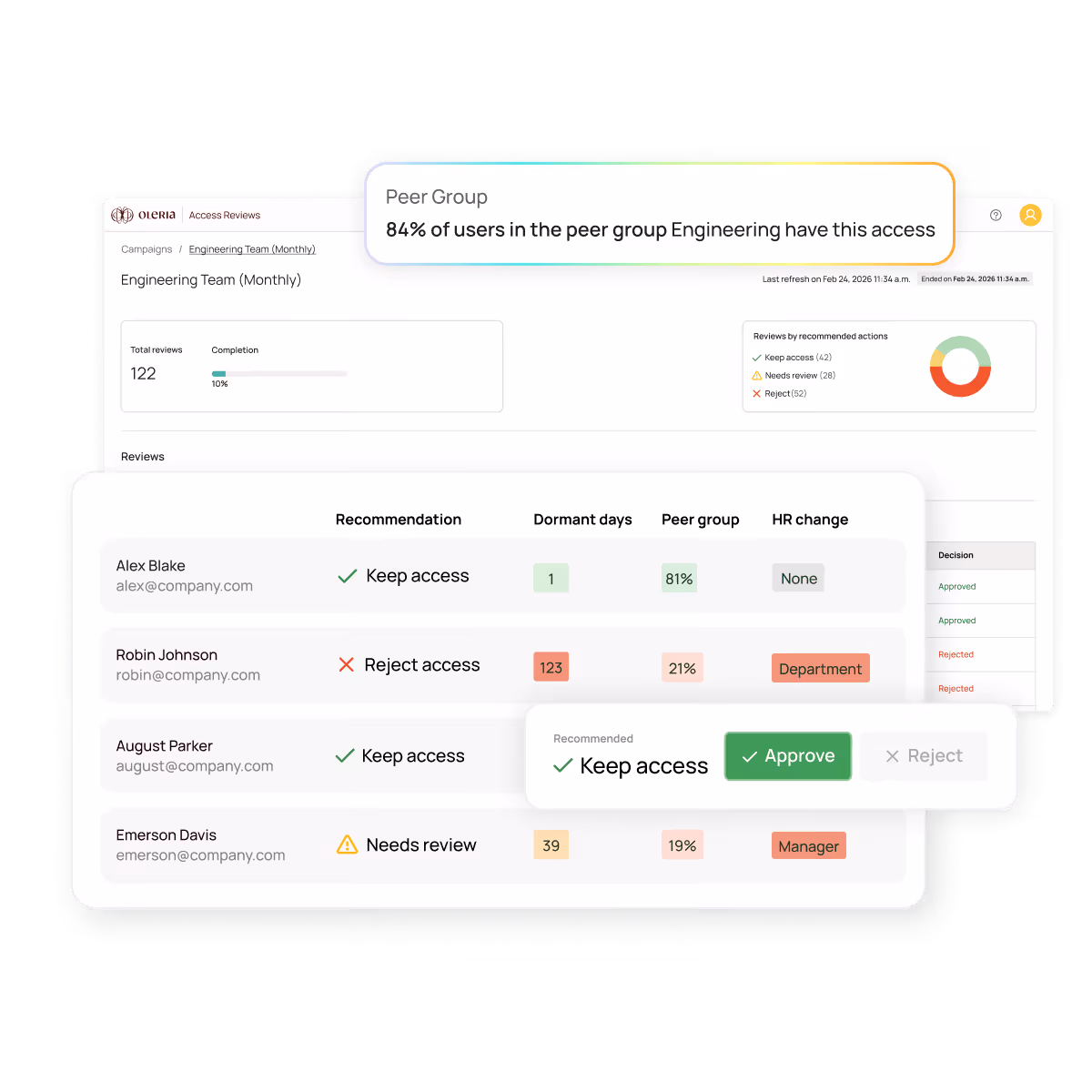 Every reviewer has the rich access insights, peer comparison, and actual usage context they need to make confident decisions on every recommendation, workflow, and access review. AI woven into Oleria’s fabric turns that context-aware access intelligence into adaptive and increasingly autonomous governance decisions.