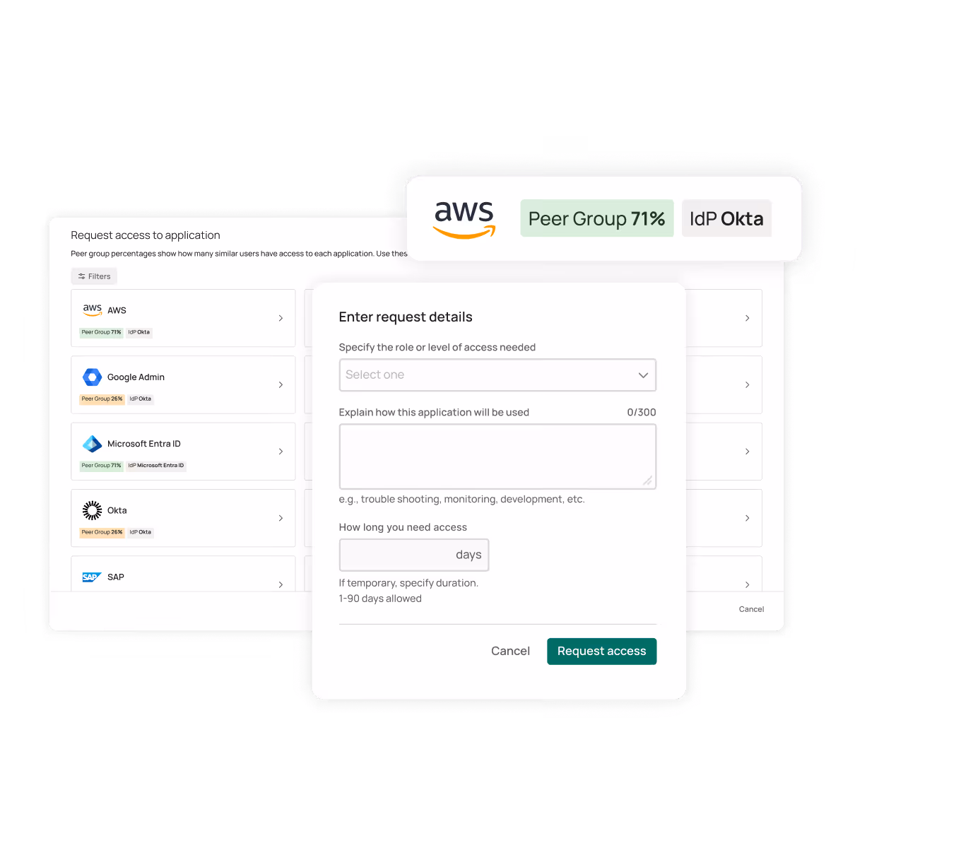 Govern where work actually happens. Conduct access reviews, approve requests, detect excessive permissions, and reclaim dormant licenses automatically. (ServiceNow, Salesforce, GitHub)