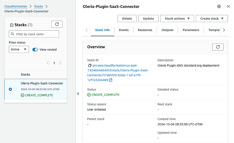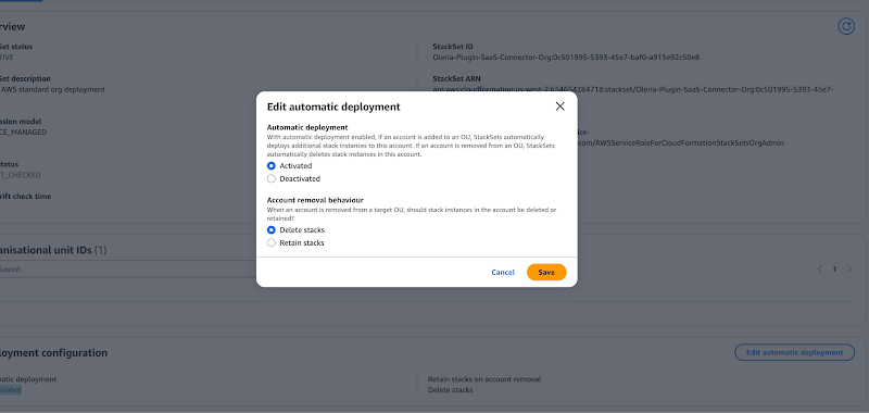 - In the CloudFormation console, navigate to StackSets from the left-hand menu. -> Select the Oleria-Plugin-SaaS-Connector-Org StackSet.-> Under the Deployment configuration section, click Edit automatic deployment. Ensure that Automatic deployment is set to Activated