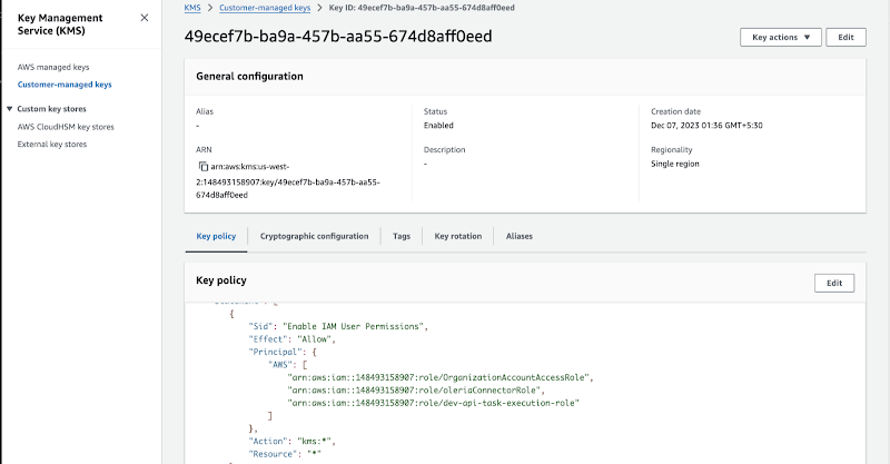 Step 8. This step is required if the S3 bucket is encrypted with a KMS key. Update the KMS key policy to allow access to the Oleria connector role. You need to perform on each account CloudTrail.