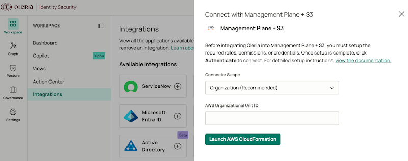 Step 3: Log in to Oleria workspace. select Integrations → select AWS Management Plane + S3. A side page opens, select Organization (Recommended), provide the organization unit ID copied in step 2 and click Launch AWS CloudFormation.