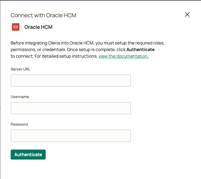 - Integration service user with admin privileges in Oracle HCM for integrating with Oleria